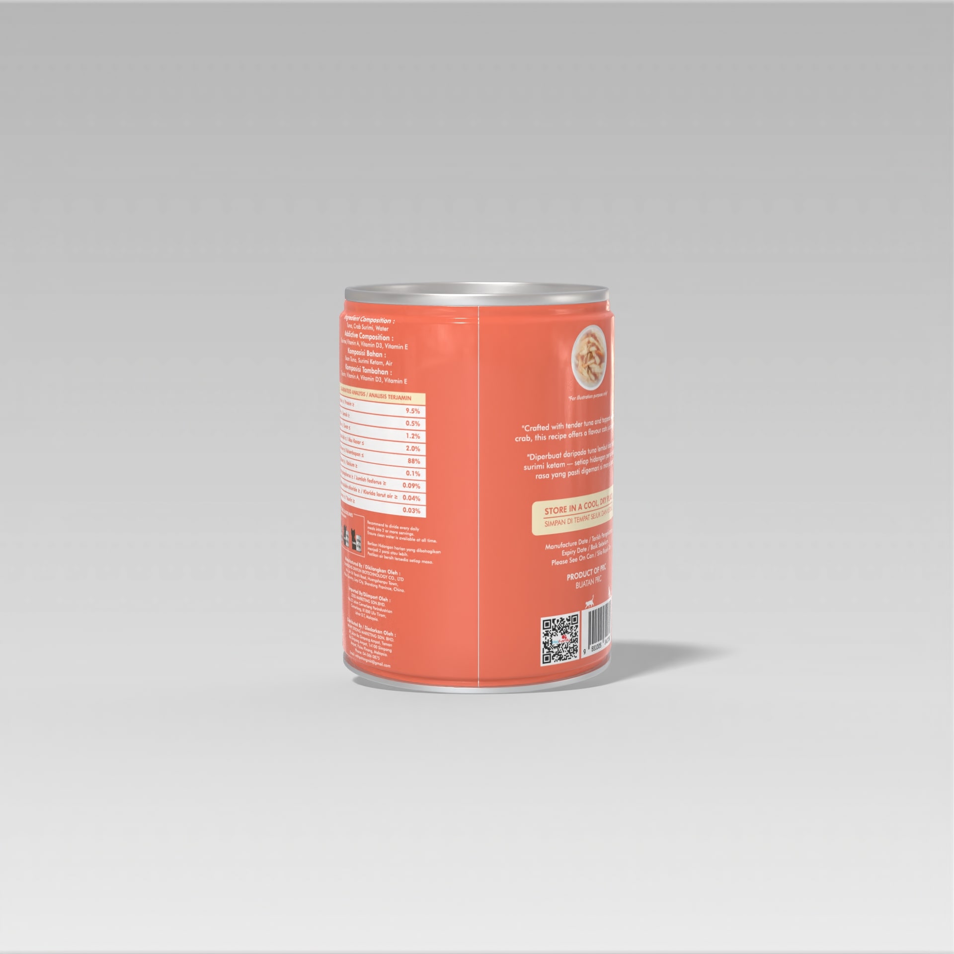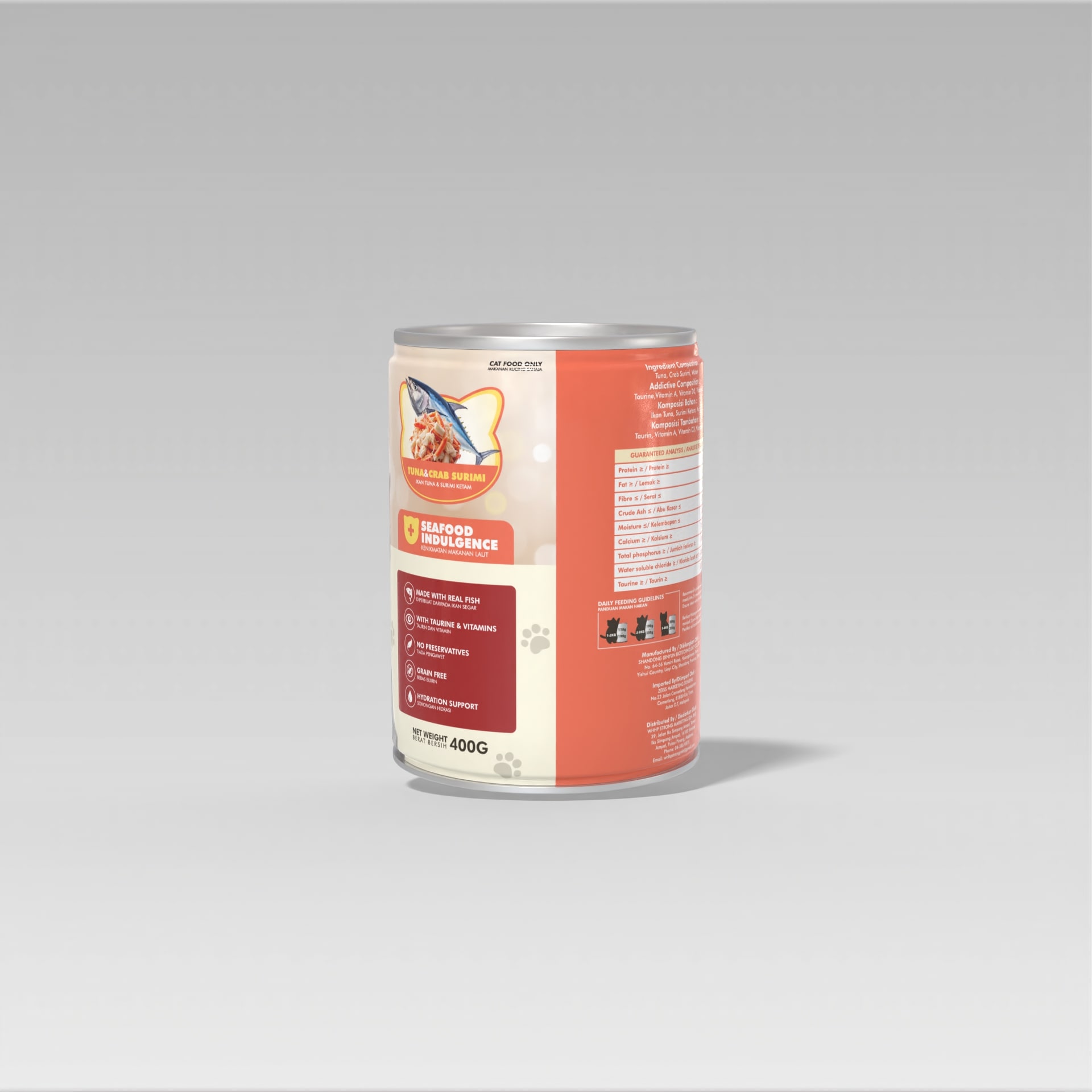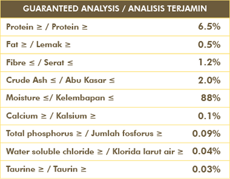Diperbuat dari ikan segar Taurin & Vitamin Tiada Pengawet Bebas bijirin Nutrisi Lengkap & Seimbang Tuna, Crab Surumi, Water Taurine, Vitamin A, Vitamin D3, Vitamin E