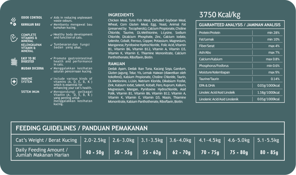 Made with dual protein from chicken and tuna to help your cat grow strong, lean muscles. Great for growing kittens and active cats. Enriched with DHA & EPA to support brain and eye growth. Taurine helps keep the heart and vision healthy. Special Shaped & Crunchy Texture of the Kibbles help cleaning the Kittens & Mother Cats Teeth. Balanced calcium and phosphorus to help build strong bones and teeth — perfect for growing cats. Full of important vitamins and minerals to boost your cat’s energy, protect against sickness, and support healthy development.