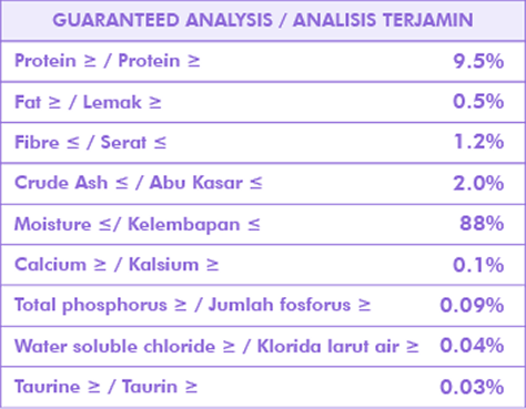 Diperbuat dari ikan segar Taurin & Vitamin Tiada Pengawet Bebas bijirin Nutrisi Lengkap & Seimbang Mackerel, Water Taurine, Vitamin A, Vitamin D3, Vitamin E